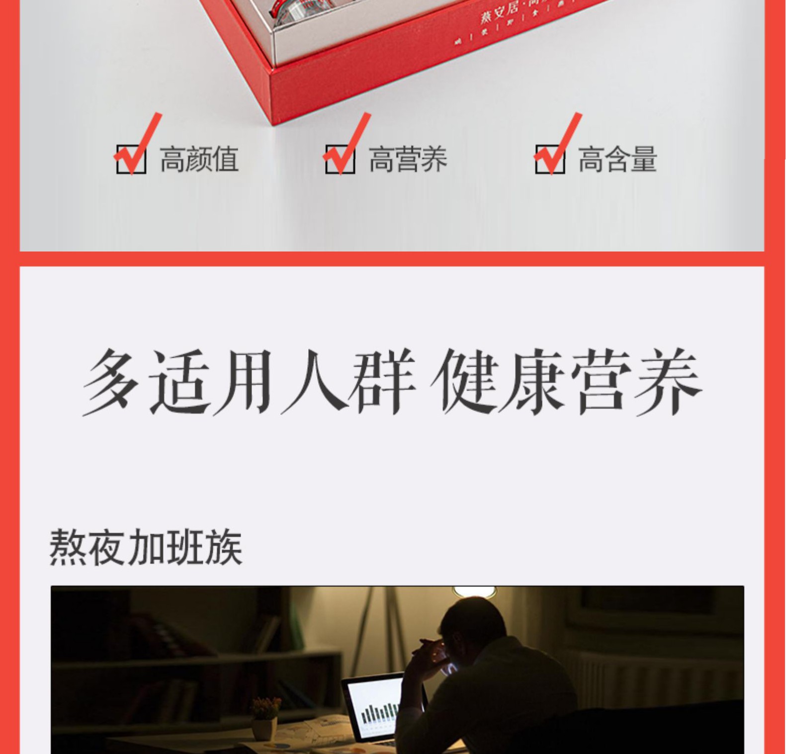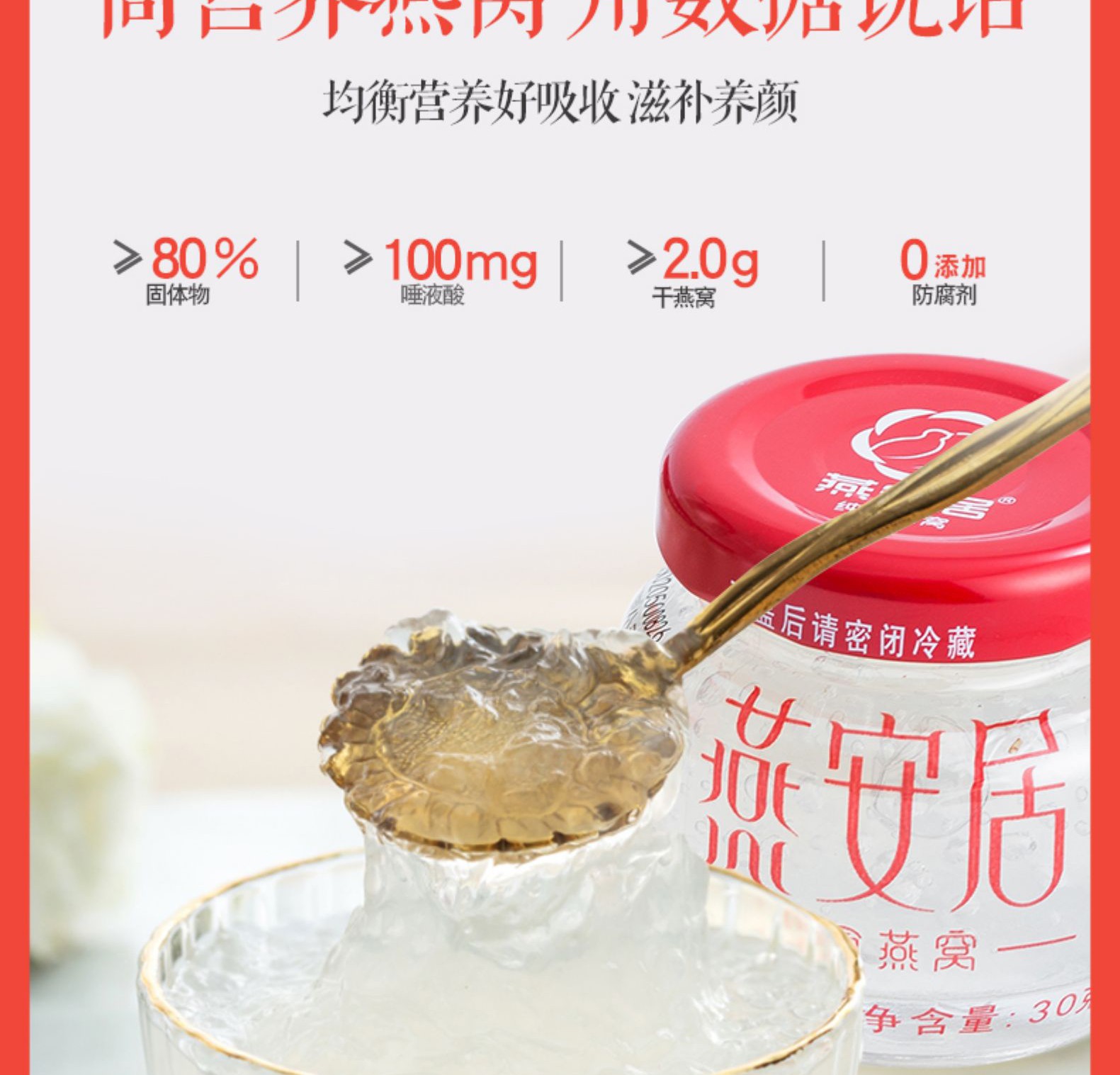 濃縮燕窩,固體含量大于80%。精選純凈燕窩(2.5克)原料,滿滿一瓶,真材實料。方便攜帶,開蓋即食。